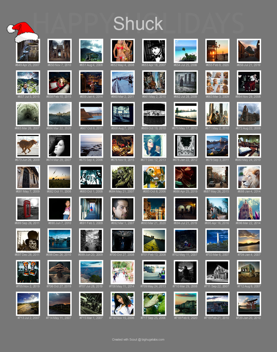 1. Old barrel painting, 2. Melrose Abbey, 3. The old wheelbarrow, 4. Musclemania, 5. Polite and quiet, 6. Tulum Beach, 7. Venice at Sunrise, 8. Peña de Bernal, 9. Self Portrait, Peru, 10. Seafronts Ride, 11. Vegas North Strip, 12. British rush, 13. 42nd Street, NY, 14. Mujer purépecha, 15. Sansón, 16. The devil barber, 17. Tunel de Ogarrio, 18. Vatican City, 19. Island Sky, Scotland, 20. Thoughtful, 21. She's waiting, Victoria Station, 22. Hudson River, 23. New Yorkers, 24. Gothic Church, 25. Samson, 26. Miriam, 27. Fog in the beach, 28. Happy Memories, 29. I'm just trying to change the world, 30. Grand Central, 31. North Sea, Scotland, 32. The Book of.., 33. Alamos, Sonora, 34. Sunday morning, 35. Se hacen llamar "peligro", 36. Canoa, Xochimilco, 37. 24 days until Halloween!, 38. Lower Antelope Canyon, 39. Cuba Libre, 40. Siegfried & Roy's Secret Garden, 41. "Telephone Booth", 42. Yohualichan Girl, 43. Misa de 8 AM, 44. Selfportrait, 45. Canal Grando, Venezia, 46. Bohemian Night, 47. Jackie, 48. San Miguel Arcángel, 49. As mad as a hatter, 50. Am Maol Ros, Scottish Borders, 51. The Shaman's Door, 52. The flooded tunnel, 53. The Yellow Path, 54. Iztaccihuatl cliff, 55. Faro del comercio, 56. Presa Oviachi, HDRi, 57. Mexico Cathedral Catrinas, 58. Hidden, 59. Angel's Point, 60. Pisaq Street, 61. Innocence of a child, 62. -P, 63. Old Cowboy Hut, 64. I luv old junk, 65. Common Landscape, 66. A storm is coming..., 67. Crash, 68. Las nuevas cajeras de Banamex, 69. Nopalera, 70. Firenze, Sunset, 71. Mexico City, 72. Japanese Landscape