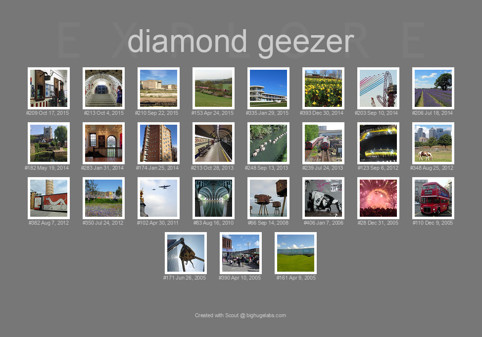1. Bow Road station ticket office, 2. Clapham South Deep Shelter, 3. Millennium Mills, 4. Central line, Theydon Bois, 5. De La Warr Pavilion, Bexhill, 6. Daffs in December, 7. Red Arrows flypast, Orbit, 8. Mayfield Lavender, 9. Waltham Abbey, 10. Every little helps, 11. The Lawn, Harlow, 12. Mornington Crescent, 13. Convoy, 14. Two Victoria line trains, 15. Reflections, 16. Mudchute City Farm, 17. Dane @Dane's Yard, 18. Mc Meadow, 19. Flypast, 20. New Thames Bridge, 21. Shivering Sands sea forts, 22. Banksy, 23. London Eye - New Year 2006, 24. The Last Routemaster, 25. The Woking Martian, 26. Lewisham, down market, 27. Laban Centre, Deptford