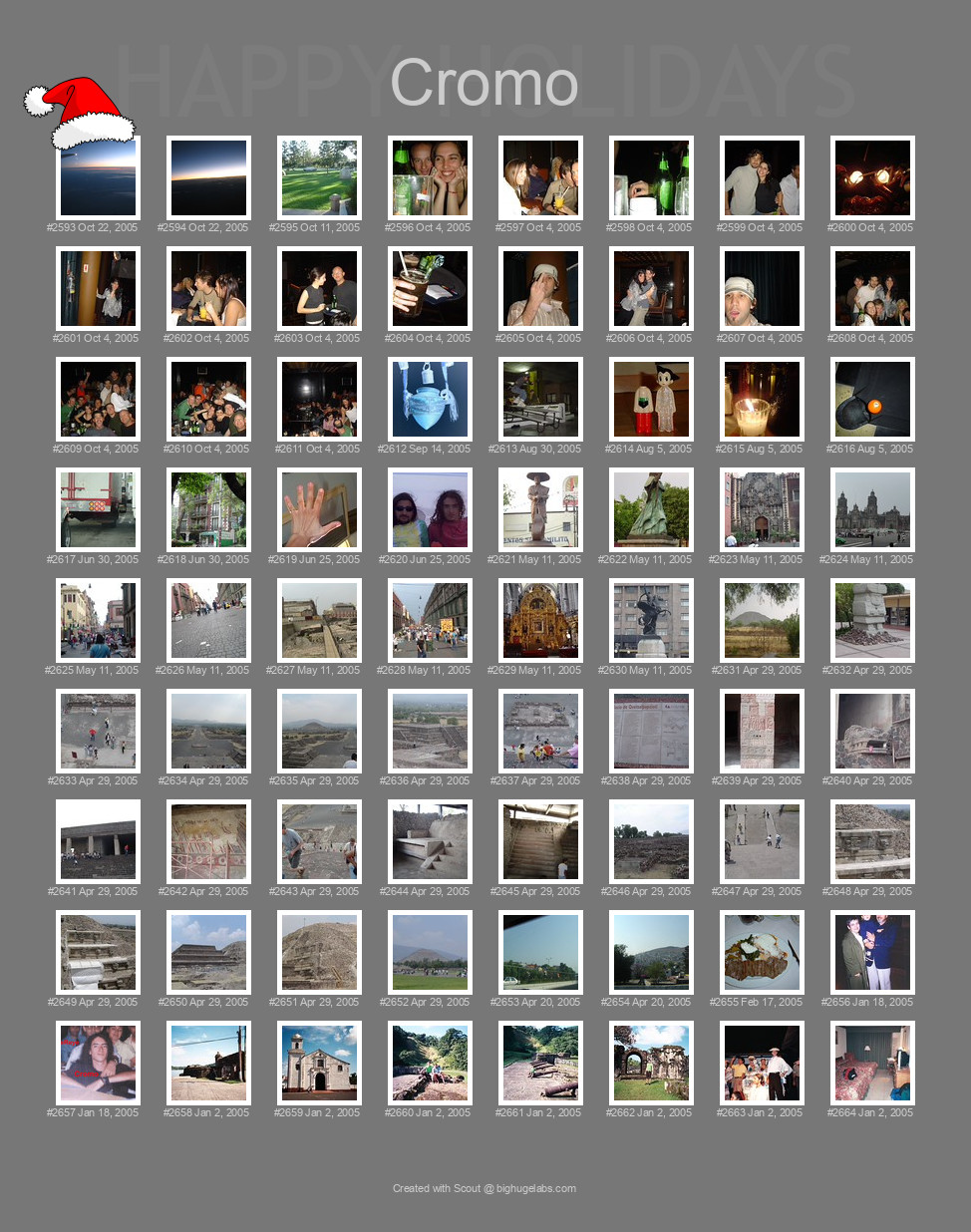 1. Vista de avion / plane view, 2. Vista de avion / plane view, 3. Placita interna medio feng shui, 4. Flap y Flor, 5. Pelianos en Kandi, 6. Pelianos en Kandi, 7. Fede y Mamucha (santi x ahi), 8. Vasos locos con pajitas locas, 9. Valeria, 10. Pelianos en Kandi, 11. Marce and moza, 12. Cuba Libre para miiiiiiiiii, 13. Dam, tb te queremos, 14. Pelianos en Kandi, 15. Pelianos en Kandi, 16. Pelianos en Kandi, 17. Pelianos en Kandi, 18. Pelianos en Kandi, 19. Pelianos en Kandi, 20. Vasija / Crock, 21. 2, 22. Astroboy from the inside, 23. Dinner light, 24. Just about to fall, 25. Lights! Lights!, 26. Other nice building, 27. Touch the window, 28. Windy day, 29. Monumento a Mariachis, 30. Monumento a Mariachis, 31. Iglesia, 32. Ciudad de México, 33. Ciudad de México, 34. Ciudad de México, 35. Ciudad de México, 36. Ciudad de México, 37. Inside the church, 38. Ciudad de México, 39. View from outside, 40. On the market, 41. View from the top of Moon Pyramid and Pelado, 42. View from the top of Moon Pyramid 3, 43. View from the top of Moon Pyramid 2, 44. View from the top of Moon Pyramid, 45. View from the Moon Pyramid, 46. House's data, 47. Butterfly carving, 48. Dragon/whatever Face, 49. Some important's people home, 50. Puma's drawing, 51. Up the Sun Pyramid, 52. More under city, 53. City under city, 54. Reconstruction of the city, 55. View from the Ciudadela's Pyramid, 56. Detailed view from the conver, 57. Pyramid cover, 58. Other view of the pyramid, 59. Pyramid, 60. View from the entrance, 61. Road to work 2, 62. Road to work, 63. great steak, 64. Mama Agus Papa, 65. Me long time ago, 66. Panama, 67. Panama, 68. Panama, 69. Panama, 70. Panama, 71. Me, at the stage!, 72. This is the hotel we stayed at